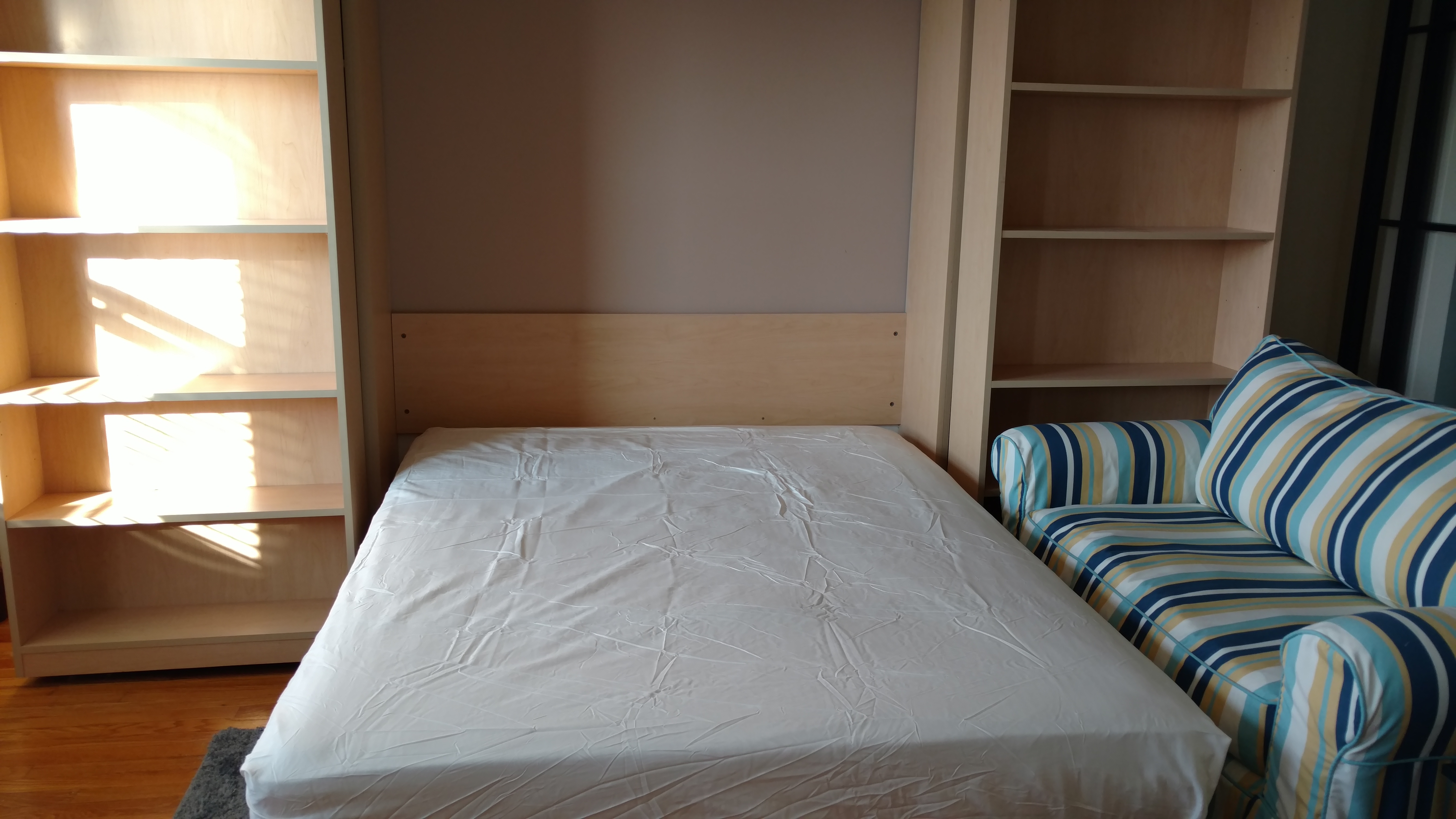 Bright and sunny with hard wood floors, couch, murphy bed, lots of closet space, storage bookshelves in the murphy bed, tiled kitchen backsplash, open kitchen counter with stools, modern shower, and washer/dryer. Dishes, pots, pans, and utensils all provided.